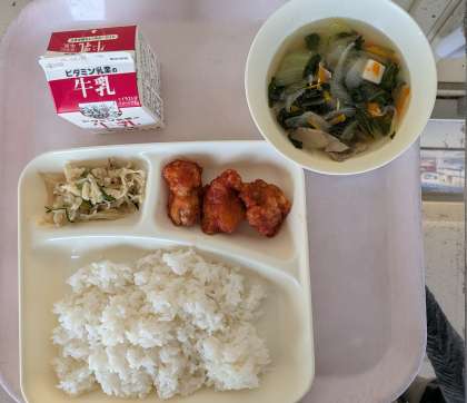今日は韓国料理の日でした。メイン料理のヤンニョムチキンとは、コチジャン、砂糖、にんにく、しょうゆなどを使った甘辛いソース(ヤンニョム)を、衣をつけて揚げた鶏肉にからめた韓国の人気料理です。外はカリっと中はジューシーな食感です。