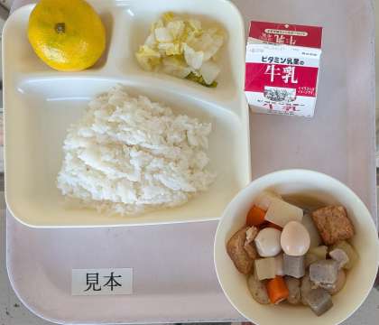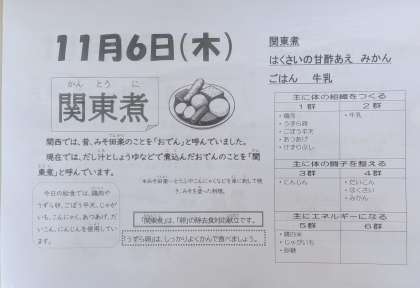 今日のメニューの関東煮(かんとうだき)は、主に関西地方で「おでん」を指す呼び方です。もともと関東地方で食べられていた、しょうゆ味の煮込み料理が関西に伝わった際、従来のみそ田楽(これも昔からおでんと呼ばれていた)と区別するためにこの名称で呼ばれるようになったそうです。