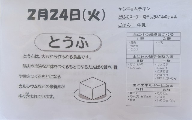 ヤンニョムチキン とうふのスープ 切干しだいこんのナムル ごはん 牛乳 です