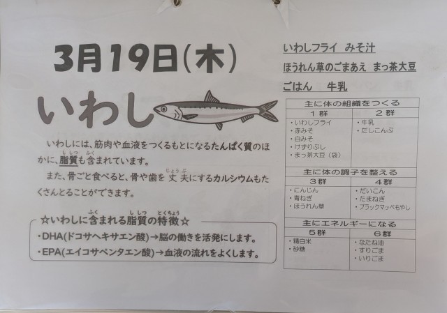 今日はいわしのフライですね。魚が苦手な生徒でもフライなら食べてくれるかな。このいわしですが獲れる時期はこれから秋ごろまでととても長い期間です。それだけ身近な魚なのですが近年、収穫量が落ちてきているのが心配です。