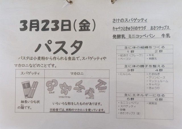 さけのスパゲッティ キャベツときゅうりのサラダ おさつチップス