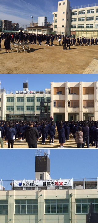 今年度初めての全校集会で、生徒は教室前から並んで運動場に降りてきます。