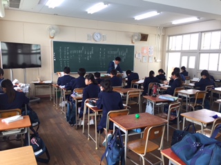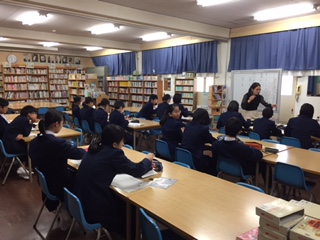・2年生の国語で分割授業をしています。本校は空き教室がないため、分割の際は図書室や多目的教室を利用しています。
