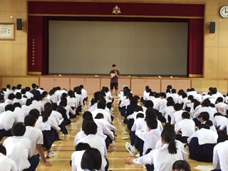 明後日に修学旅行を控え、体育館で事前指導が行われました。しおりをもとに行程・持ち物など最終の確認をしています。