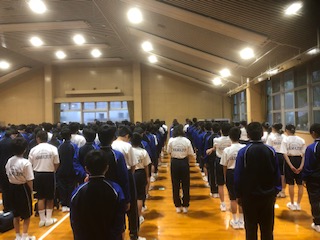 朝のつどいは、同宿の中学校と合同のつどいを行いました。