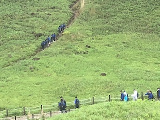 ポイントでの課題にみんなで、校歌合唱がありました。ここ曽爾高原に美しい歌声が響いていました。