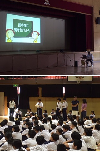 事前に指導を受けている、保健委員会の生徒が映像を使いながら熱中症についての説明と注意を行った後、クイズ形式で生徒に質問をすることで学習のおさらいをしていました。