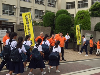・本校では年6回「社会を明るくする運動」の取り組みとして、保護司さんや更生保護女性会など地域の方々と本校PTAの方が8時〜正門前であいさつ運動をしています。