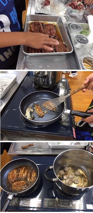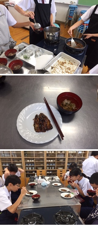 イワシを一人2匹「てびらき」し、かば焼きとつみれ汁を作っています。「てびらき」には、最初は悲鳴のような声も上がっていましたが、周りの生徒も実践するなかで、全員が自分で「てびらき」をしました。