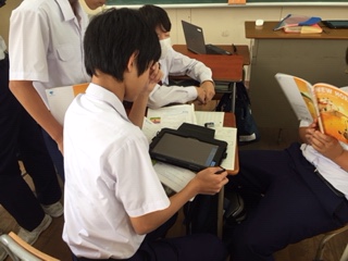 教科書の読み物教材を、グループでの英語劇としての発表することを目指して、発音・抑揚などの音声的表現力と身振り手振りや表情などの視覚的表現力をタブレットを使い映像に残して、自分たちでチェックしています。