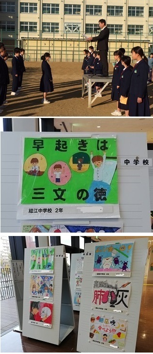 ・城東区学校保健協議会の健康生活に関するポスターでの優秀作品の表彰と、卓球部の2ブロック1年生大会での表彰(3位)が行われました。おめでとうございます。