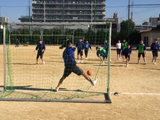 前時より、ルールを学んだあと、シュート練習等、さらにゲームへと進展していますが、キーパーは至近距離からのシュートにも対応しなければならず、難しそうです。