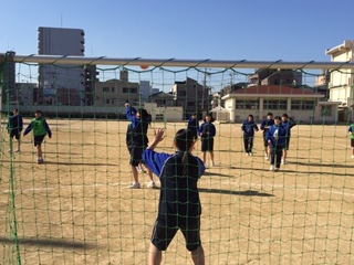 ・2年生女子が運動場で球技種目でハンドボールをしています。