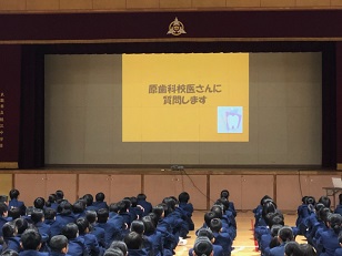 1年生で「歯と口の健康教室」を6時間目に体育館で実施しました。