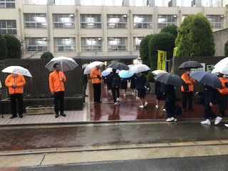 本日、「社会を明るくする運動」で地域の保護司さんや更生保護女性会、本校PTAの方々が8時〜正門前でのあいさつ運動に来てくださいました。
