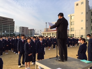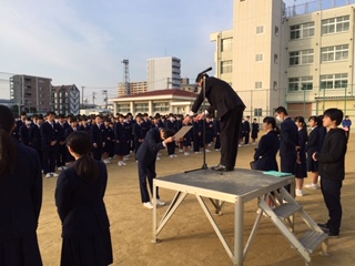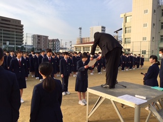全校集会で、女子バスケットボール部(2ブロック大会)、剣道部(修道館杯)、卓球部(大阪市中学生選抜卓球大会)の各表彰が行われました。