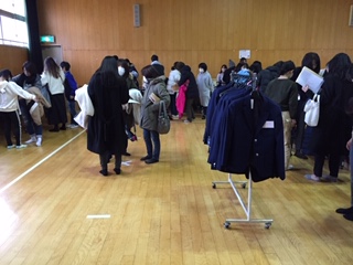 本日、格技室で新入生の制服採寸と、体操服・体育館シューズの申し込みがありました。