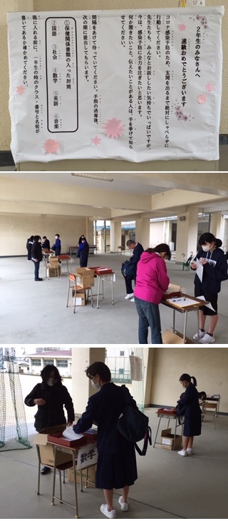 2年生は当初4月8日に提出予定としていた宿題や保健関係のプリントを回収し、新しい家庭学習用の宿題や学校からのプリント類と教科書を受け取って帰ります。