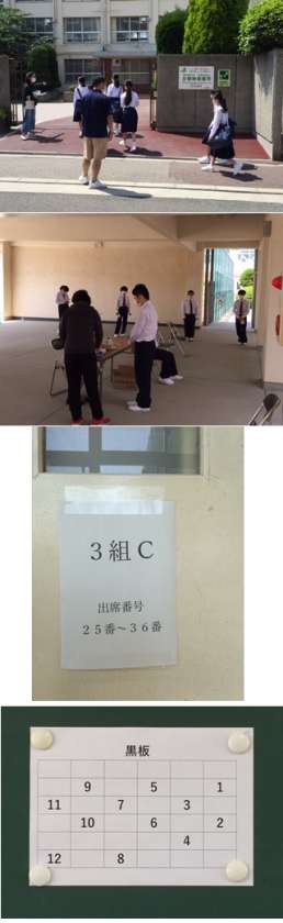 *各時間帯のはじめに2年生のクラス分けの発表を行った後、出席番号で3分割して教室に入ります。