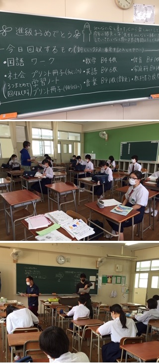 昨日の2年生と同様、登校時に3年のクラス分けの用紙をもらい、新しい3年生の学級(1〜6組)にそれぞれ分かれて教室に入ります。