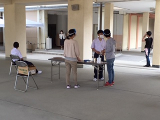 5月の臨時休業中は、学年ごとの登校日でしたが、今は全学年の半分が一斉に登校します。検温忘れの生徒で、ピロティ—が密にならないようにお願いします。