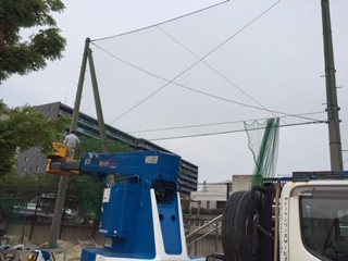 本日、グランドの防球ネットの一部の補修工事が行われています。