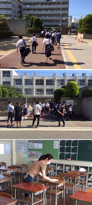 ・今日も生徒下校後は、机の消毒を先生たちで行っています。