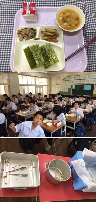 いわしてんぷら・五目汁・豚肉とさんど豆の炒め物です。残食もありません、ごちそうさまでした。