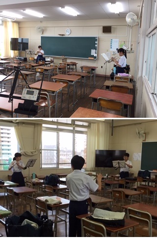 ・本日も部活動では、距離を保ちながらの練習や、教室では2方向の窓を開けての吹奏楽の練習などに取り組んでいました。