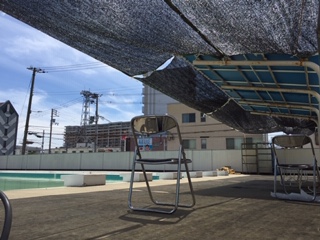 ・管理作業員さんが、プールに、日よけをつくってくださいました。