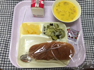 ・本日の給食は、パン、かぼちゃのクリームシチュー、ミックス海そうのサラダ、りんご(カット缶)でした。