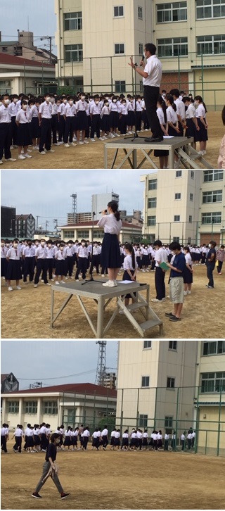・本日、初めて全校生徒が運動場に集合しての全校集会が開かれました。