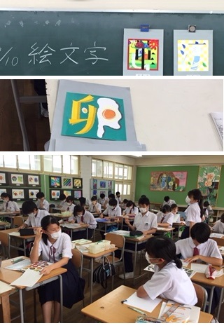 ●3年生の美術で「絵文字」の下書きを、先輩たちの作品を見本に考えていました。