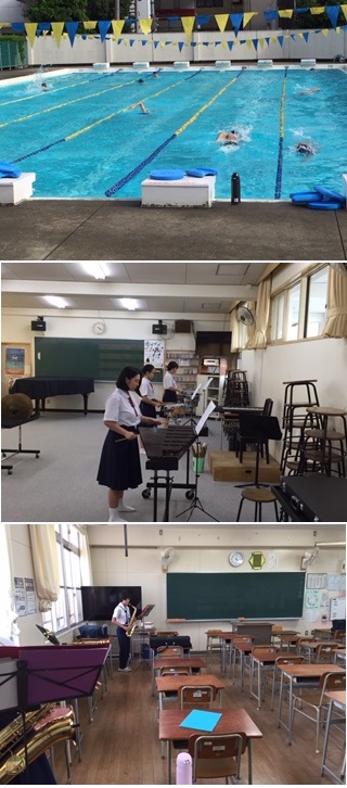あいにくの雨で、運動場の部活動は今日はありませんが、水泳部、吹奏楽部や格技室では卓球部、体育館では女子バスケットボール部が練習を再開していました。