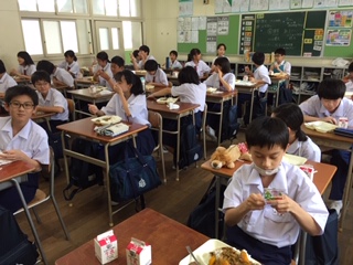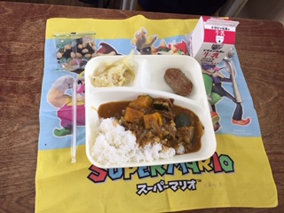かぼちゃ・なすなどが入ったカレーで少し甘めでおいしくいただきました。