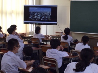 その後は、教室で担任より、避難経路の説明と火災発生時の初期行動についての説明、さらに消防庁の『火災』に関する映像資料を視聴し、プリントで問題を解くなどの学習をしました。