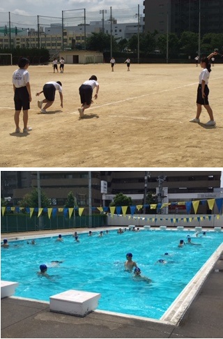 ・3年生体育。女子は運動場で短距離(50m走)、男子はプールで12分間泳をしています。