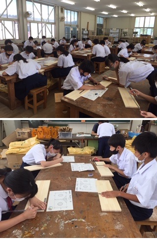 ・1年生技術。木工で「本立て」づくりをしています。本立ての側面にオリジナルのデザインを考えているところです。