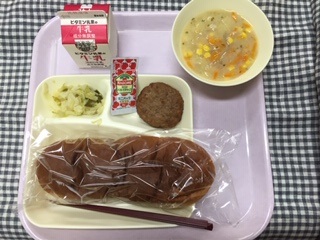 ・今日の給食は、焼きハンバーグ・豆乳スープ・キャベツとピーマンのソテーでした。