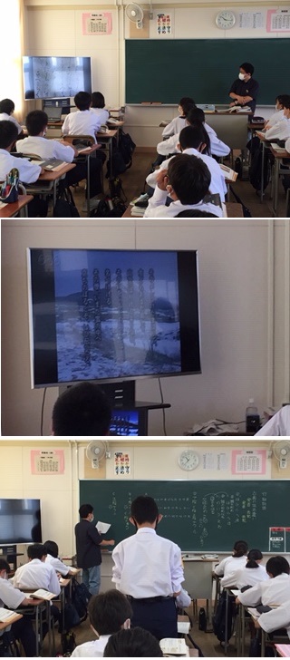 教科書音読の後は、映像で、作品の時代背景と作品を確認し、その後は古典の特徴である「歴史的かな遣い」について学んでいました。