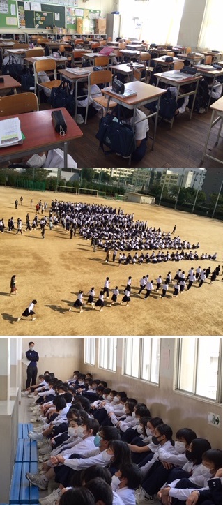 揺れがおさまると、運動場に避難して整列・点呼を取ります。建物の倒壊も考え、運動場の中心に集合しました。