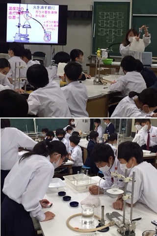●理科では、水とエタノールの混合物を加熱し、沸点の違いから分離を行う実験をしています。