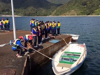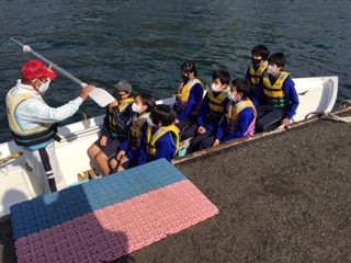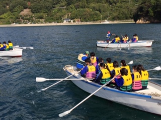 9〜10人で乗船し、みんなで声を出して力を合わせて漕ぎます。