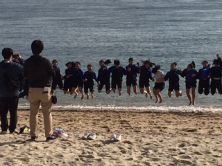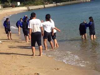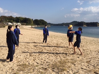 海洋センター近くの浜で、ビーチバレーやフリスビーをして楽しい時間を過ごしています。