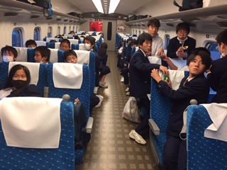 帰りの新幹線では、疲れて休んでいる生徒もいますが、クラスメイトとトランプなどで最後まで修学旅行を満喫している生徒もいます。