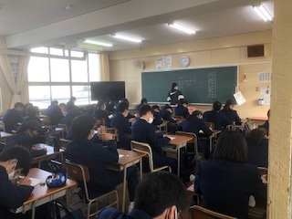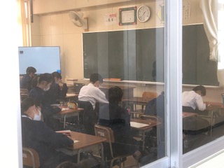 2年生は、昨日の学年競技会の感想作文を書いていました。5組の教室の時計の横には「優勝の証」が飾られていました。そのあと、先日、先行して3年生が学んでいました「平和をまなぶつどい」を各クラスでビデオ学習として行いました。今年度は、コロナ禍の影響で講演を直接聴くことはかないませんでしたが、生徒の皆さんは静かに集中して学習していました。