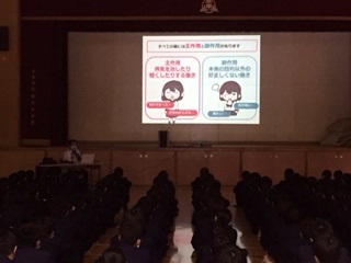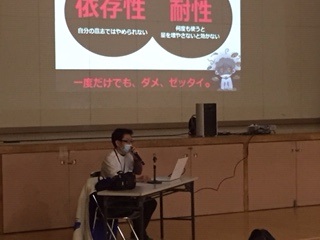 本校の薬剤師先生を講師にお招きし、パワーポイントや動画を使い、薬の役割、薬の正しい使い方(目的・時間・量)、薬物の乱用や薬物依存症、違法薬物を誘われたときの対処法などについて説明していただきました。