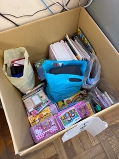 鉛筆・消しゴム、色鉛筆・色ペン、シャープペン・ボールペン、定規、ノート、クレヨン等々なんと段ボール5つ分あったようです。