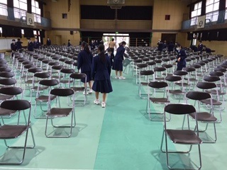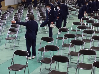 感染症予防のため、座席の間隔を決められたスペースにできるだけ多く確保するために椅子の並べ方を工夫するなど、2年生の皆さんが、式場図の通りに先生方の指示に従い、てきぱきと動き、大変良く協力してくれました。ありがとうございました。