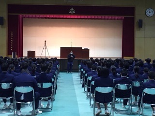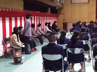 本日、1・2時間目に卒業式の予行を終え、3時間目は体育館で学年集会が行われました。